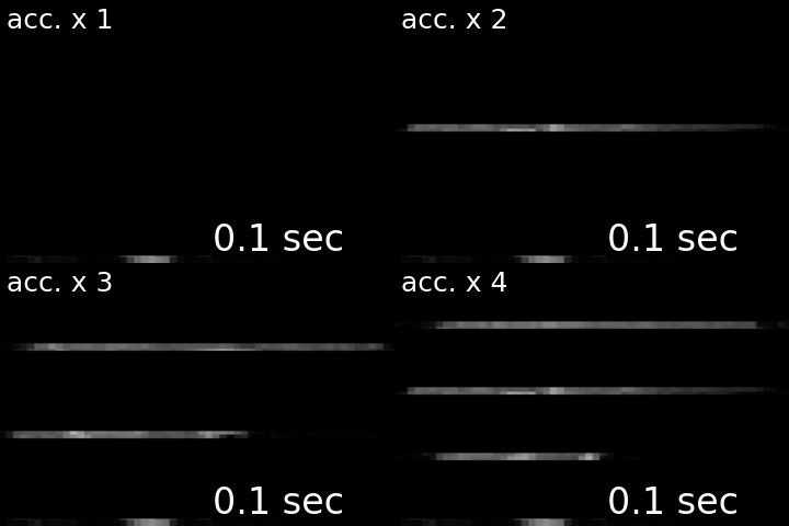 For a visual comparison between different approaches, see the following gif (note, top left is the acquisition without any acceleration).