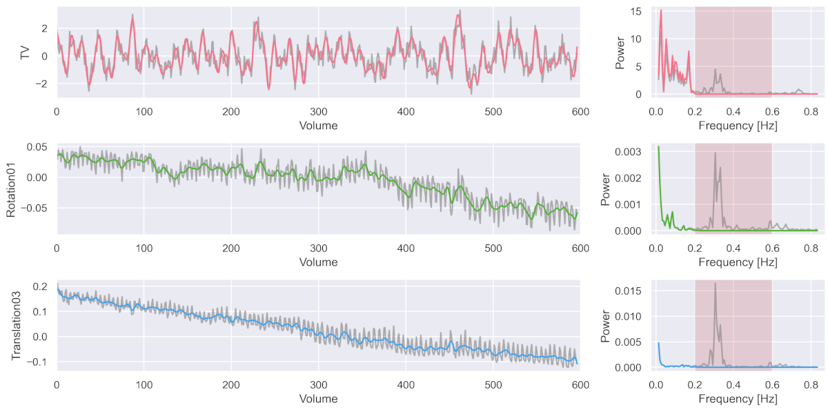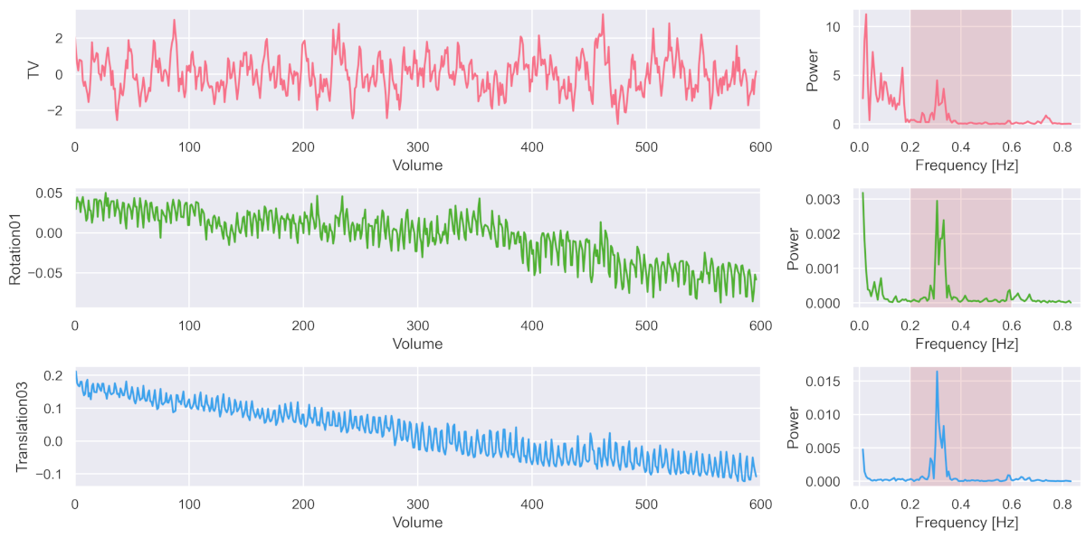 The following three figures on the left show the recorded average signal activation throughout the brain (i.e. in the ‘total volume’ = TV), plus two of the six estimated motion parameters (rotation around x-axis = Rotation01; translation in z-direction = Translation03). And on the right, you can see the corresponding frequency power spectrum.