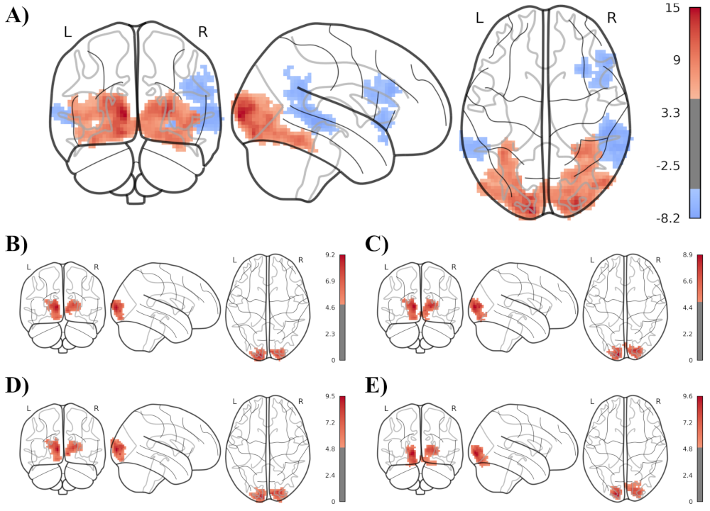 The following illustration shows a single subject’s statistical map of the brain activation differences during audio-visual versus audio only stimulation, using 5 different analysis methods. Panel A) shows my newly developed approach using a temporal low-pass filter at 0.2Hz, panel B) shows the same approach without the temporal low-pass filter and panel C) to E) show the comparable state of the art neuroimaging toolboxes fMRIPrep, FSL and SPM.